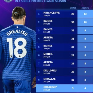 开局3场4助!格拉利什有望冲击埃弗顿队史英超单赛季12次助攻纪录