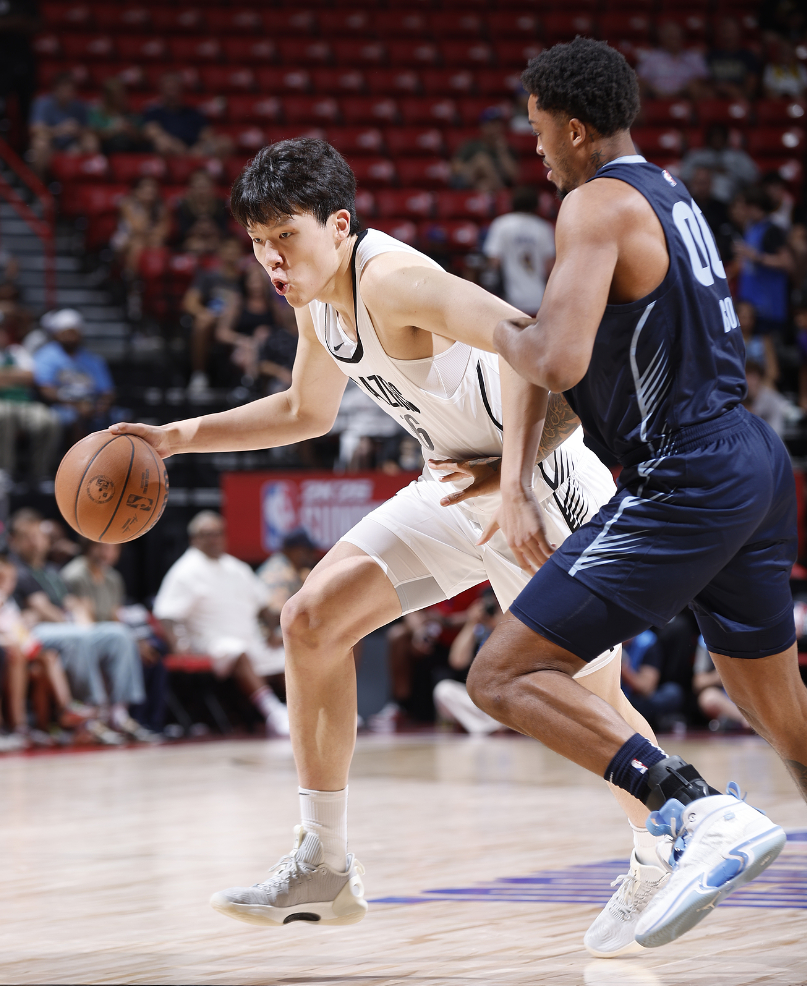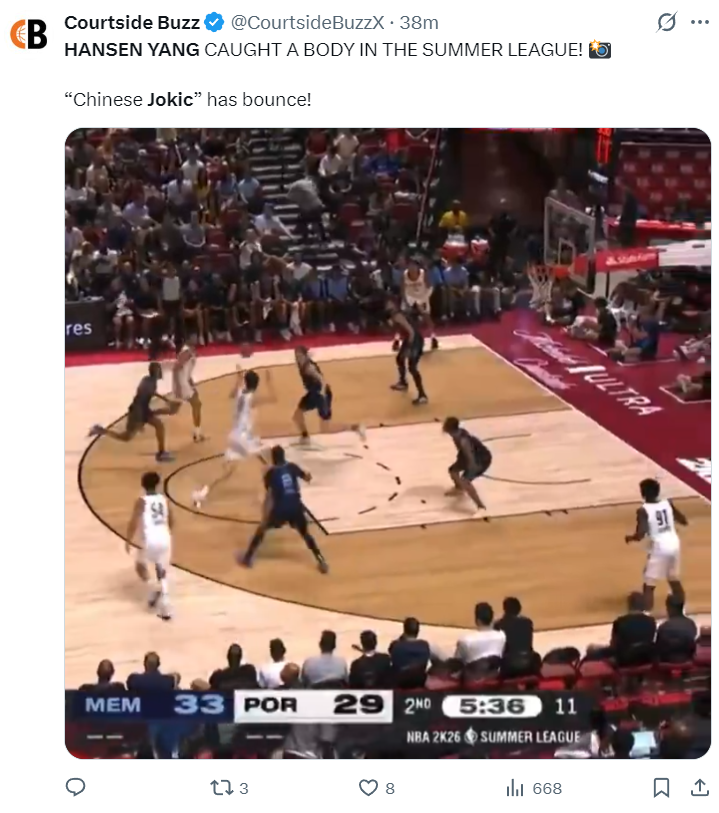 美媒CB写道:杨瀚森夏联完成了隔扣,中国约基奇展现了他的弹跳能力。