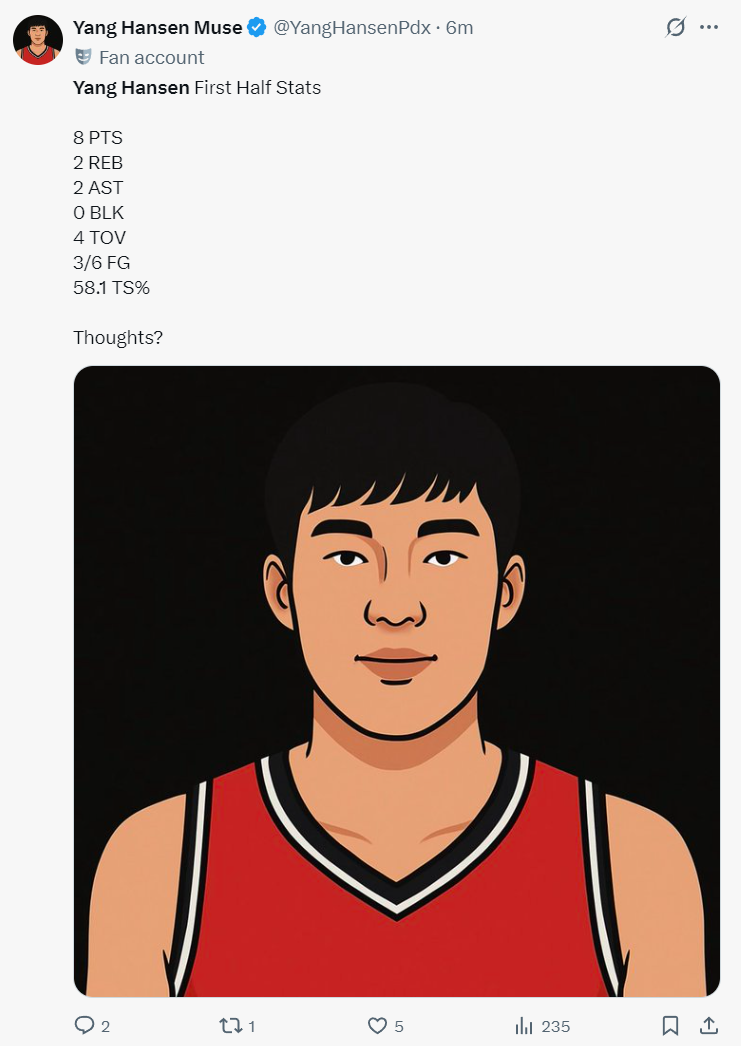 开拓者官方晒出了小杨的隔扣海报,小杨试了第二个三分不中,不过他盖掉了巴科的上篮,还剩3分22秒杨瀚森被换上,上来就走步失误,防辛顿的三分成功,杨瀚森连续拿了两个篮板,小杨助攻佩古拉空篮结果没上进,第三节杨瀚森8分4篮板2助攻1盖帽5失误。