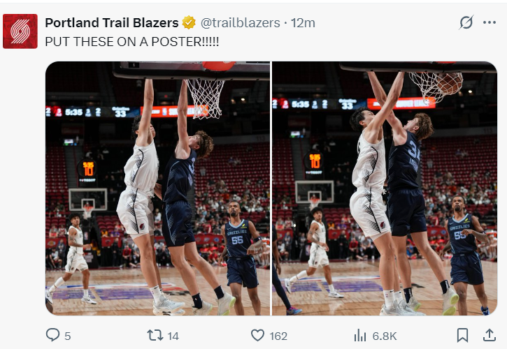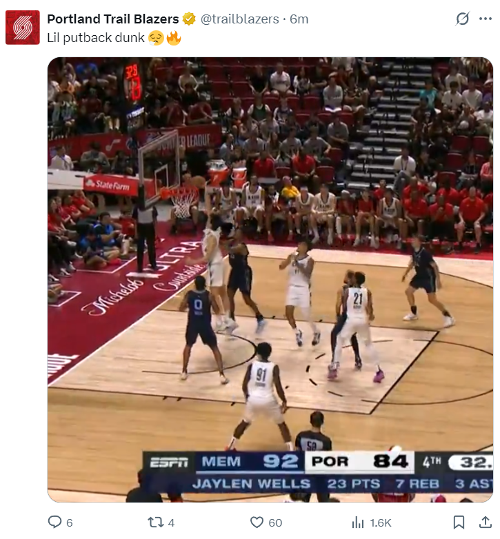 开拓者官方也晒出了杨瀚森完成补扣的瞬间,这场比赛杨瀚森依旧亮点满满。