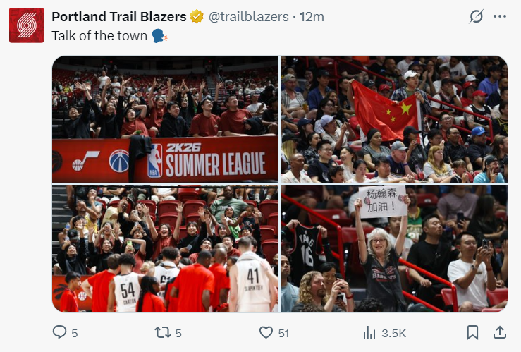 开拓者官方给了现场来为杨瀚森加油球迷的图集。