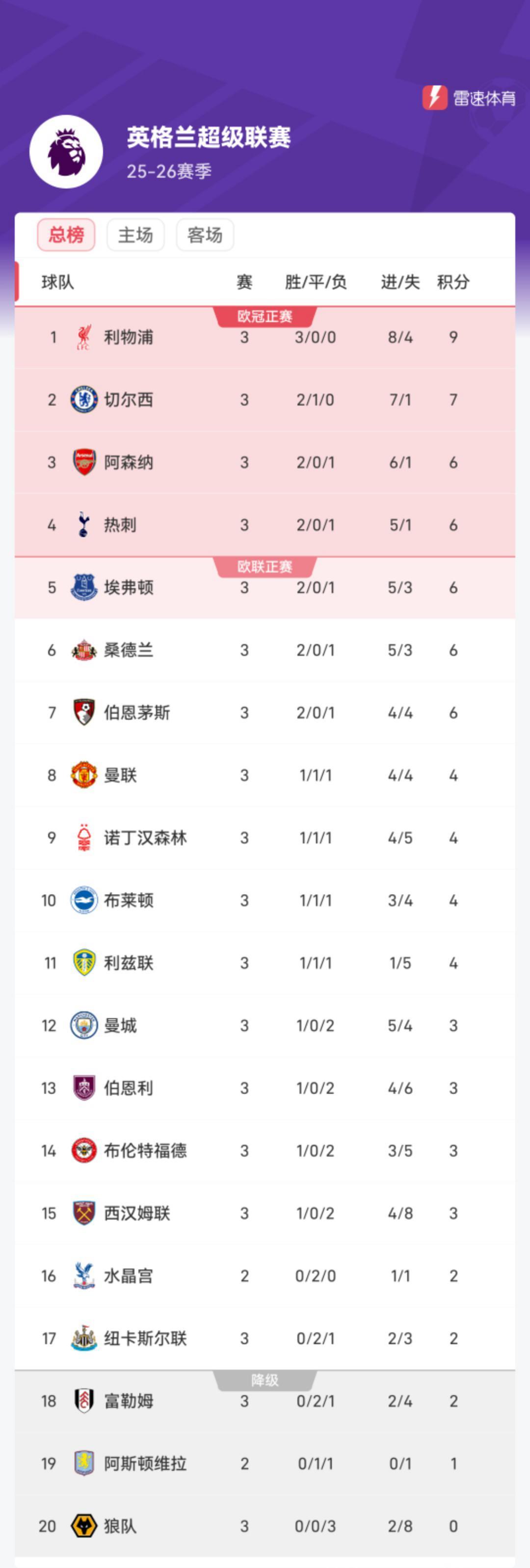 雷速体育9月1日讯 英超第3轮结束了大部分的比赛,目前英超的积分榜上,利物浦唯一三战全胜积9分排名榜首。